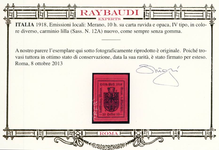 MERANO 1918 - 10 h. carminio lilla, carta ruvida e opaca, IV tipo, errore di colore (12A), nuovo senza gomma, perfetto. Splendido e molto raro. Cert. Raybaudi.