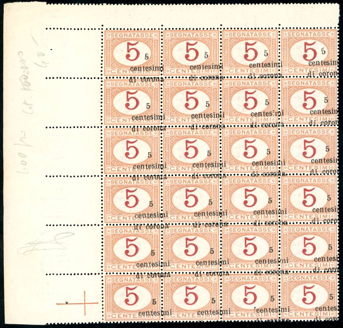 TRENTO E TRIESTE SEGNATASSE 1919 - 5 su 5 cent., soprastampa obliqua a cavallo (1l), blocco di 24 esemplari, angolo di foglio, gomma originale integra, perfetto. Ferrario.