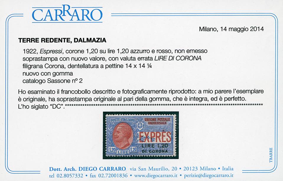 DALMAZIA ESPRESSI 1922 - 1,20 lire su 1,20 lire (1), gomma originale integra, perfetto. Molto bello. Cert. Carraro.