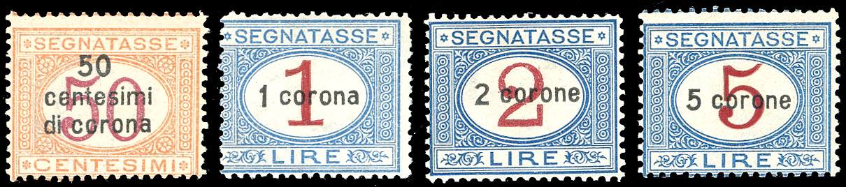 DALMAZIA SEGNATASSE 1922 - Soprastampati, serie completa (1/4), gomma originale integra, perfetti. Molto freschi. Sorani per i due alti valori.
