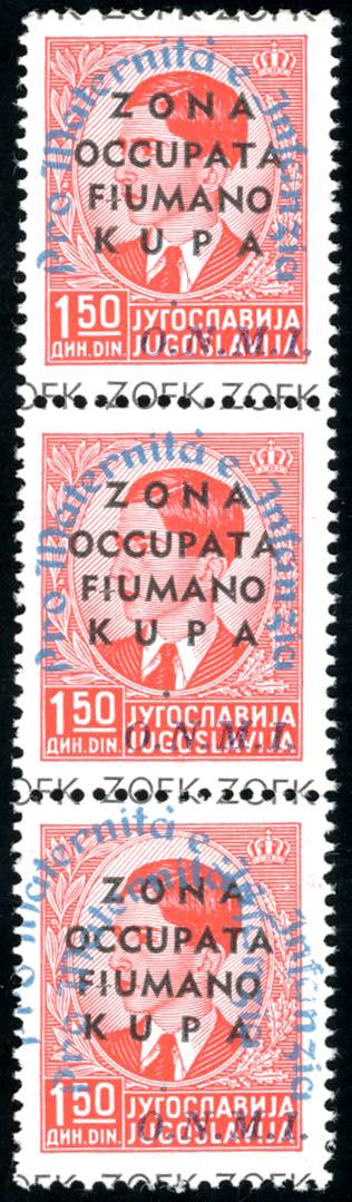 ZONA FIUMANO KUPA 1942 - 1,50 d. Pro Maternità Infanzia, striscia verticale di tre, l'ultimo esemplare con doppia soprastampa (38/38b), ... Read more