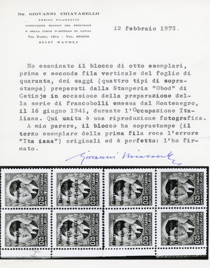 MONTENEGRO 1941 - 25 p. blocco verticale di otto con le quattro diverse soprastampe di saggio (1, nota), bordo di foglio, ricostruito tramite linguella tra la seconda e la terza riga, gomma originale per i quattro esemplari in alto, senza gomma gli altri, perfetto. Raro ed interessante. Rayubaudi, cert. Chiavarello.