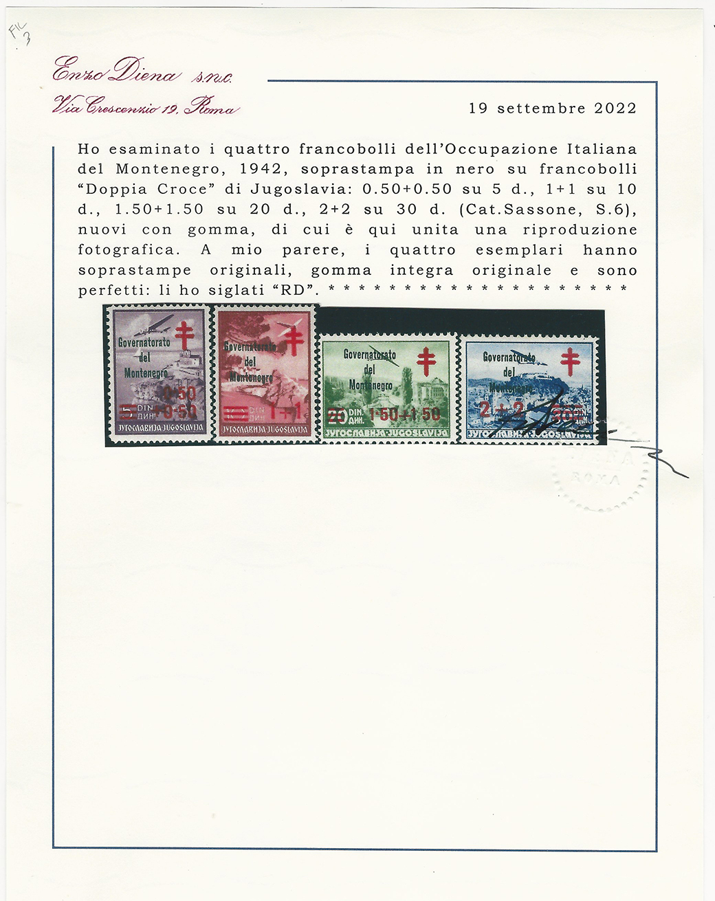 MONTENEGRO 1942 - Croce Rossa, soprastampa nera, serie completa (32/35), gomma originale integra, perfetti. Rari e di ottima qualità. Cert. Ferrario e Diena.