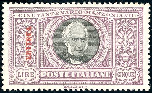 1924 - 5 lire Manzoni (76), ottima centratura, gomma originale integra, perfetto. Molto bello! Cert. Bottacchi.