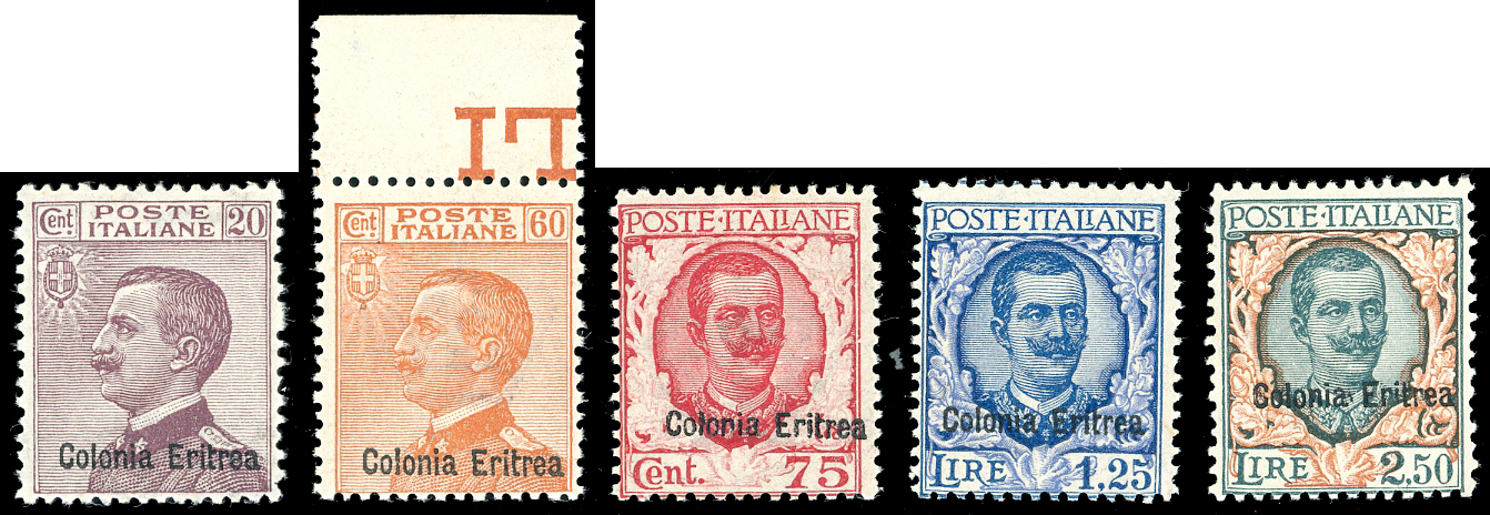 1928/29 - Soprastampati, serie completa (123/127), gomma originale integra, perfetti. Molto freschi. Cert. Ferrario.