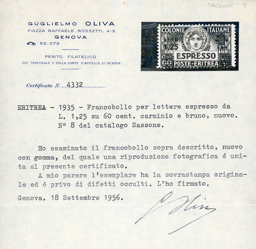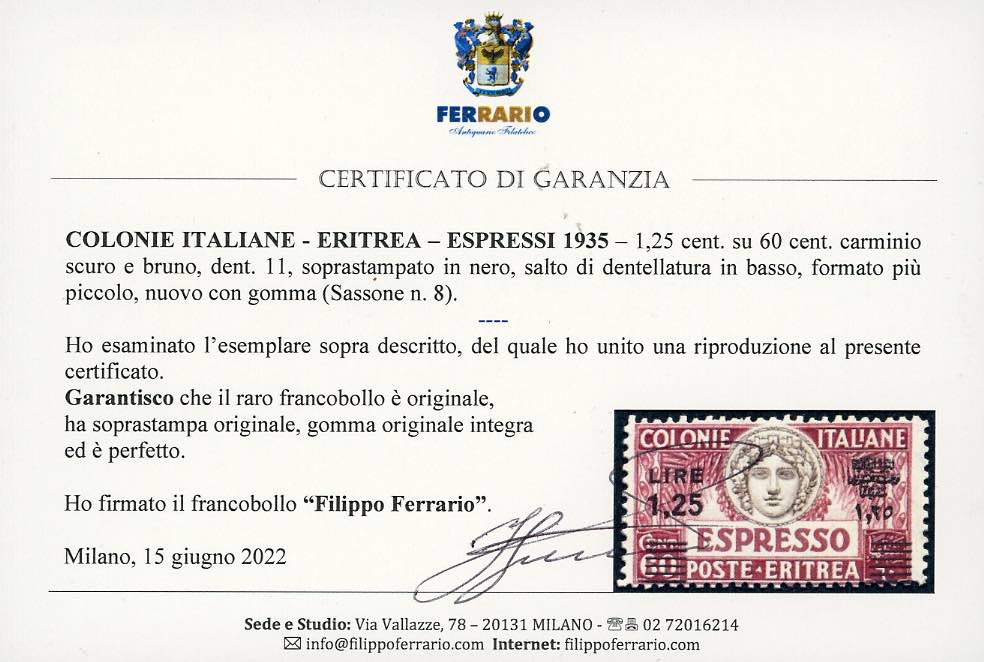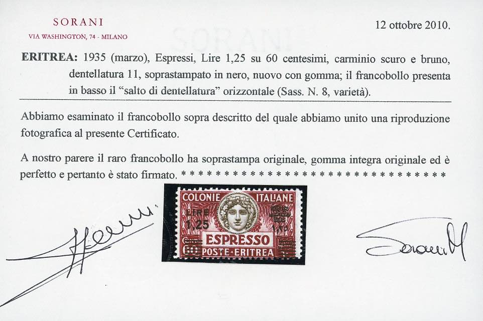 ESPRESSI 1935 - 1,25 lire su 60 cent., dent. 11, soprastampato in nero (8), salto di dentellatura in basso, formato più piccolo, gomma originale integra, perfetto. Raro e varietà non catalogata. G.Oliva, Sassone, cert. Sorani e Ferrario.