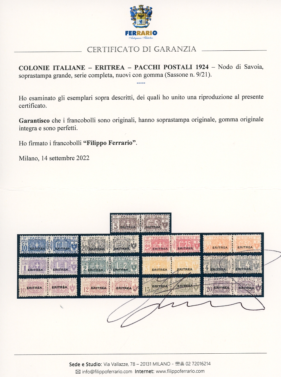PACCHI POSTALI 1917/24 - Nodo di Savoia al centro, soprastampa grande, serie completa (9/21), gomma originale integra, perfetti. Cert. Ferrario.