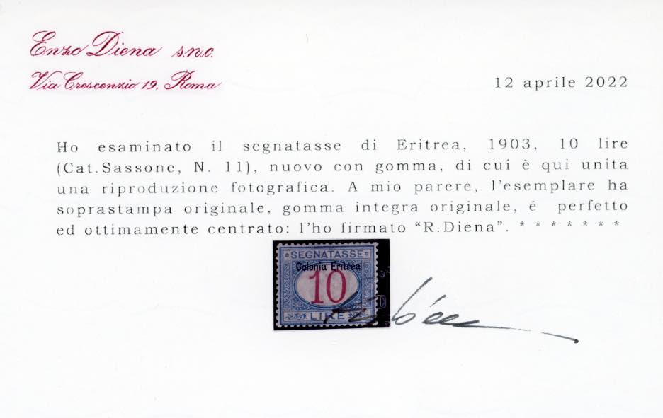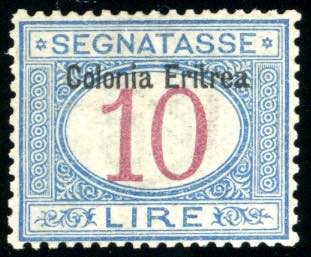 SEGNATASSE 1903 - 10 lire, soprastampa in alto (11), ottima centratura, gomma originale integra, perfetto. Bello e molto raro in queste condizioni. A.Diena, Sorani, cert. Diena.