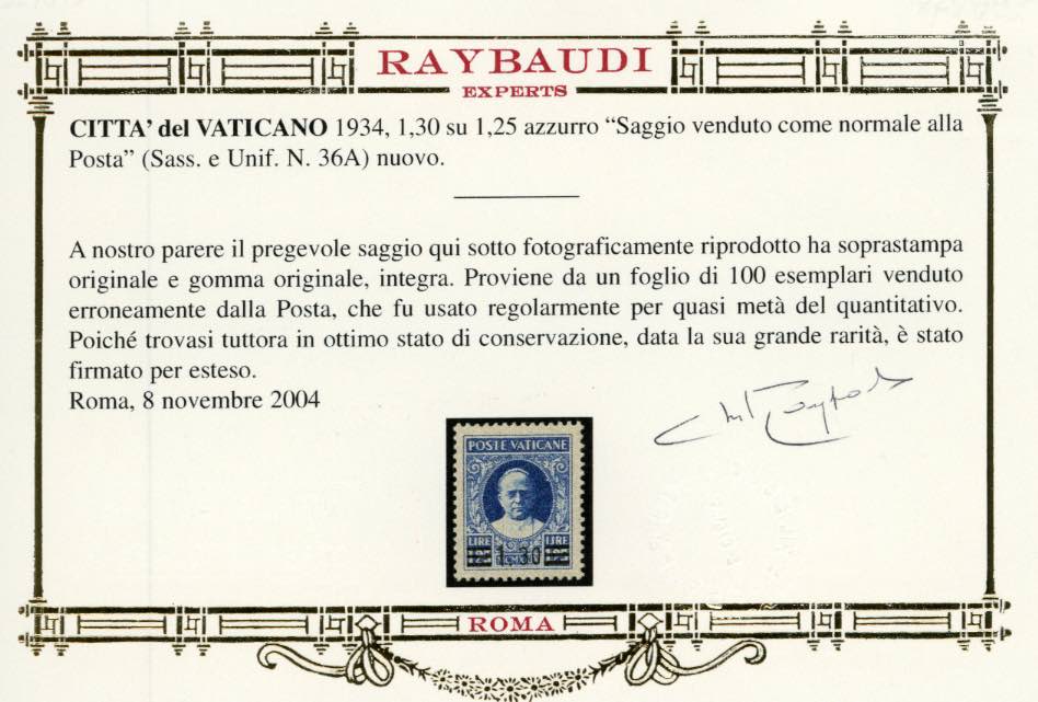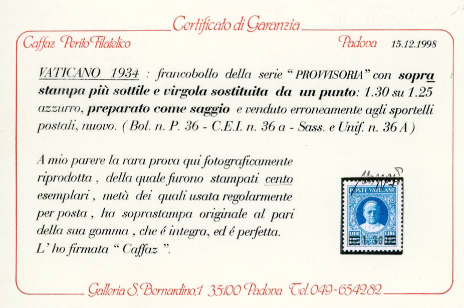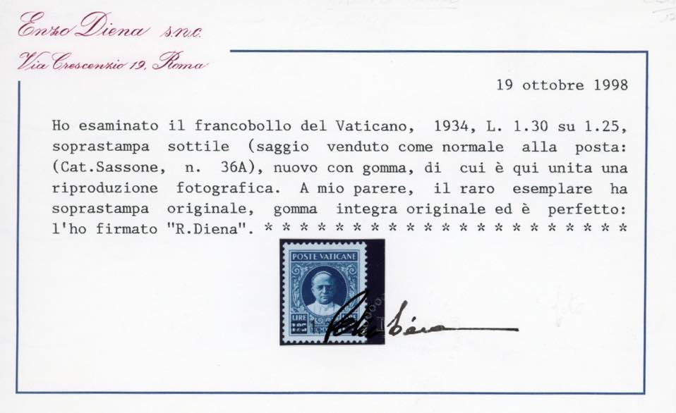 1934 - 1,30 lire su 1,25 lire Provvisoria, soprastampa sottile, saggio venduto come normale alla posta (36), ottima centratura, gomma originale integra, perfetto. Si tratta di uno dei migliori esemplari noti di questo rarissimo francobollo. Tiratura 100 esemplari, di cui la maggior parte usati postalmente. Em.Diena, cert. Diena, Oro Raybaudi e Caffaz.