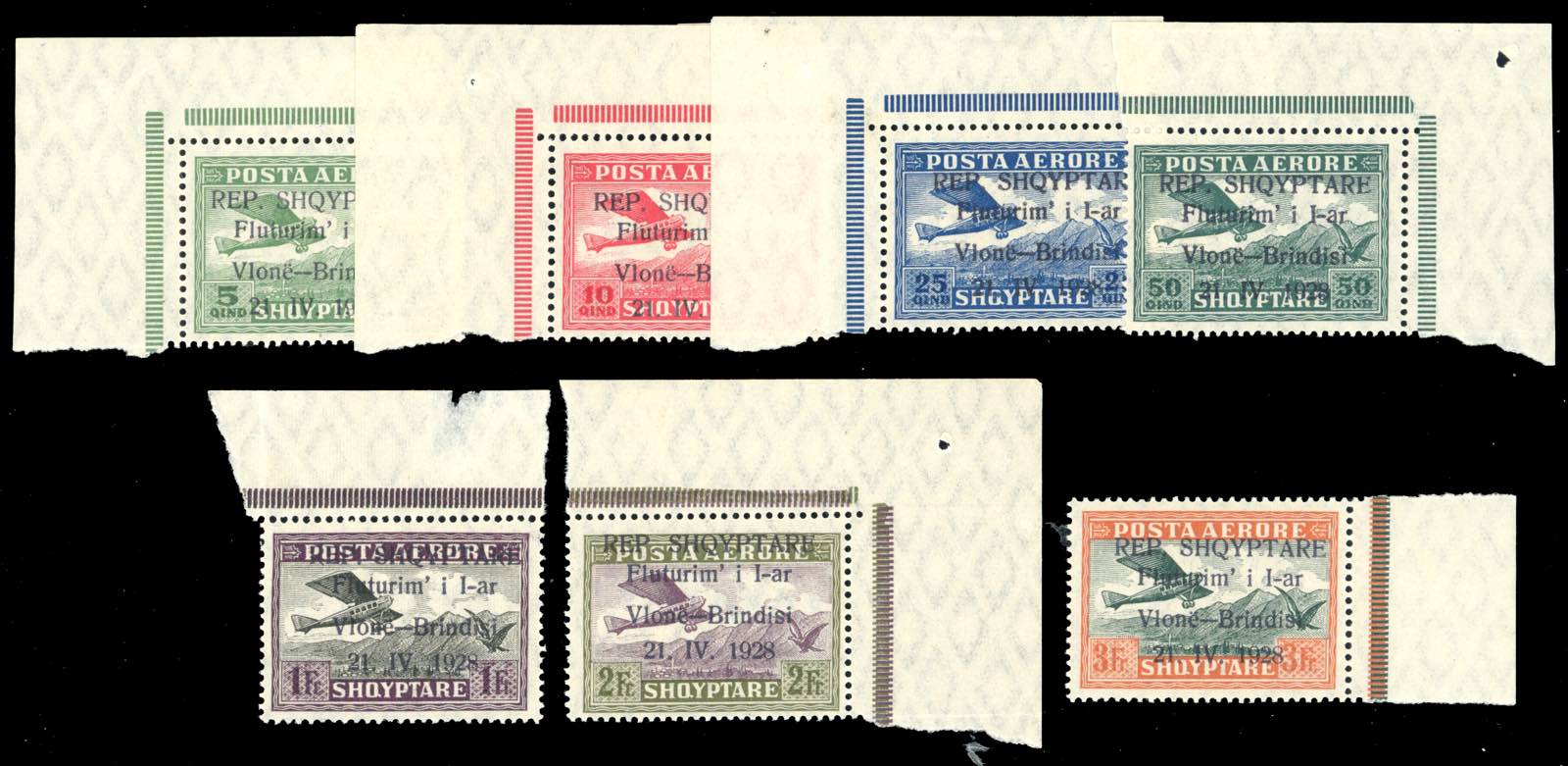 ALBANIA POSTA AEREA 1928 - Volo Valona - Brindisi soprastampati, serie completa (A15/A21,Mi.162/168), angolo/bordo di foglio, gomma originale integra, perfetti.