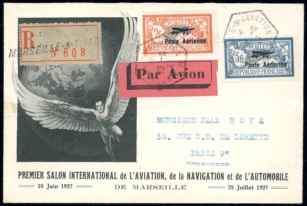 FRANCIA POSTA AEREA 1927 - Salone aeronautico, serie completa (A1/2), perfetti, usati su busta raccomandata con il bollo speciale della manifestazione da Marsiglia 25/6/1927, primo giorno d'emissione, a Parigi.