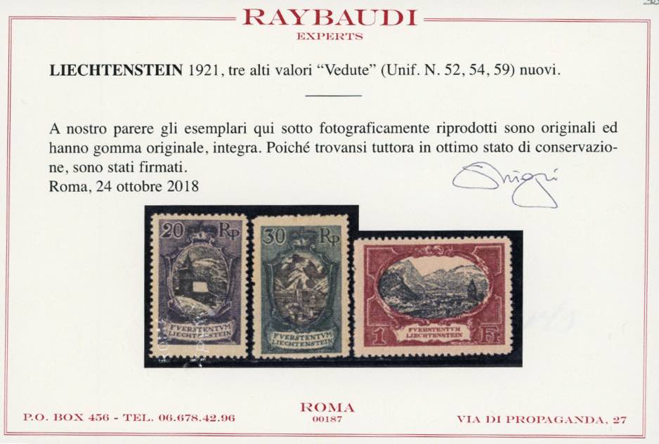 LIECHTENSTEIN 1921 - Vedute, serie completa (52/59), gomma originale integra, perfetti. Cert. Raybaudi per gli alti valori.