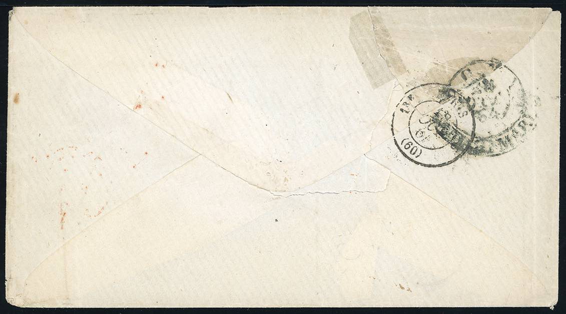 BAHAMAS 1864 - 12 September 1864, single-rate letter from Nassau to Rome, prepaid 1s 4d to destination: 1d inland and 1s 3d credited to UK: 5d carriage to the U.K., 10d foreign transit. The letter was probably taken by a Cunard steamer to New York where it was put aboard the British packet Persia of the Cunard line on October 5. It arrived at Queenstown on 15 October. In London, the "PD" was applied confirming payment to destination. On 17 October it received the datestamp of the Travelling Post Office Calais-Paris. On the reverse there are the transit datesamp of Paris and the delivery datestamp of Rome. Only 3 letters recorded from the Bahamas to the Papal States in the period 1850-1870 (Ex. coll. Mentaschi).
