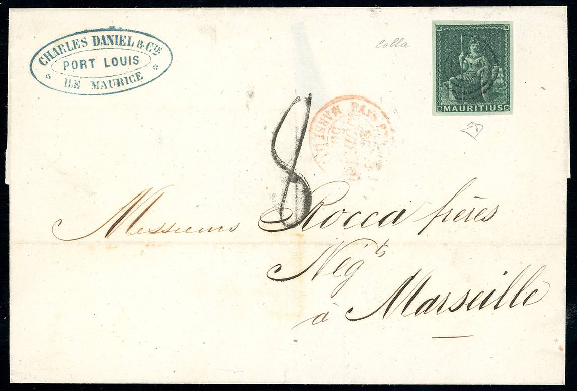 BRITISH COLONIES - MAURITIUS 1858 - 4 d. verde (SG 27, Yv.12), perfetto e ben marginato, su lettera senza testo da Port Louis 8/7/1859 a Marsiglia, tassata 8. Splendida! E.Diena, cert. Colla.