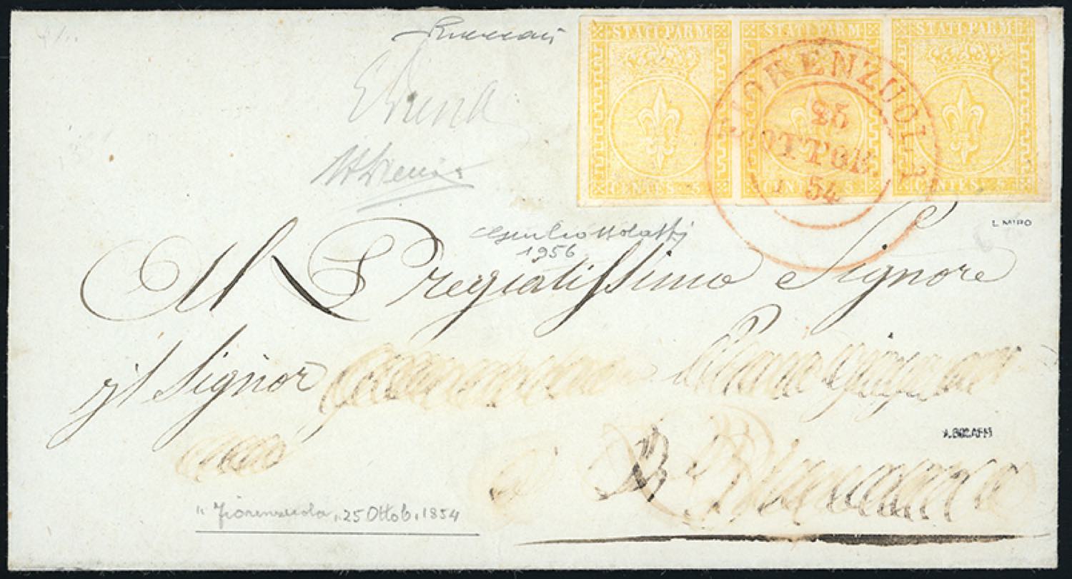1854 - 5 cent. giallo chiarissimo (6b), striscia orizzontale di tre, perfetta e ben marginata, su fresca sovracoperta di lettera da Fiorenzuola 25/10/1854, doppio cerchio rosso, a Piacenza. Eccezionale qualità, lettera da esposizione. Em. e A.Diena, Vaccari, cert. Giulio Bolaffi per esteso.