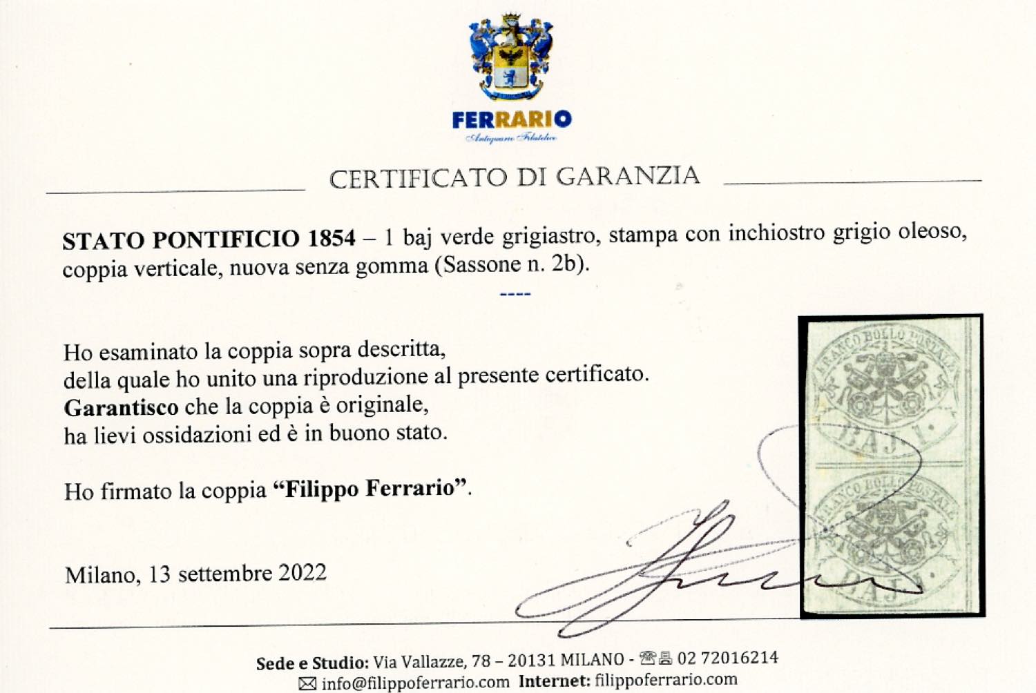 1854 - 1 baj verde grigiastro, coppia verticale, stampa con inchiostro grigio oleoso (2b), nuovo, senza gomma, coppia verticale, lievi ossidazioni. E.Diena, cert. Ferrario.