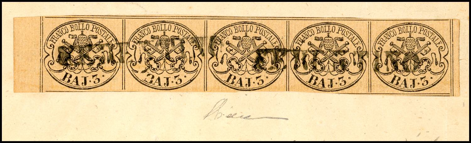 1853 - 3 baj bistro arancio (4), striscia orizzontale di cinque, bordo di foglio nei due lati verticali, perfetta, su sovracoperta di lettera da Ferentino a Roma 9/3/1853. Molto rara e di ottima qualità. Cert. Diena.