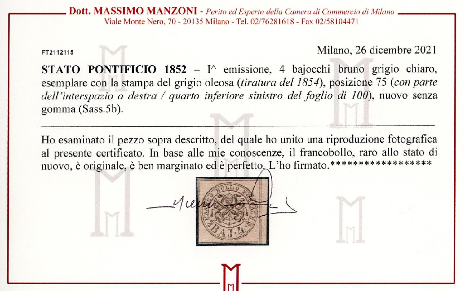 1854 - 4 baj bruno grigio chiaro (5b), bordo di foglio, nuovo senza gomma, perfetto e con ottimi margini. Raro e di ottima qualità. Em.Diena e cert. Manzoni.