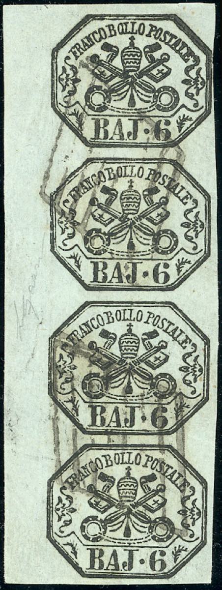1852 - 6 baj grigio verdastro (7), striscia verticale di quattro, bordo di foglio, usata, perfetta. Molto fresca. E.Diena, G.Oliva. Ex coll. Imperato.