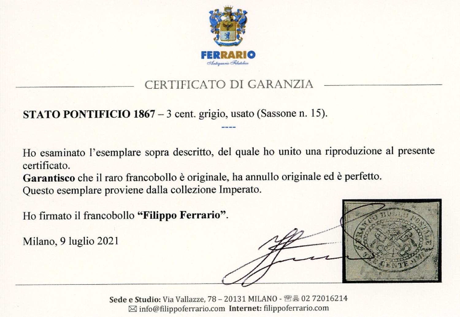 Lot 415 - 1867 - 3 cent. grigio (15), usato, perfetto. Splendido e ...
