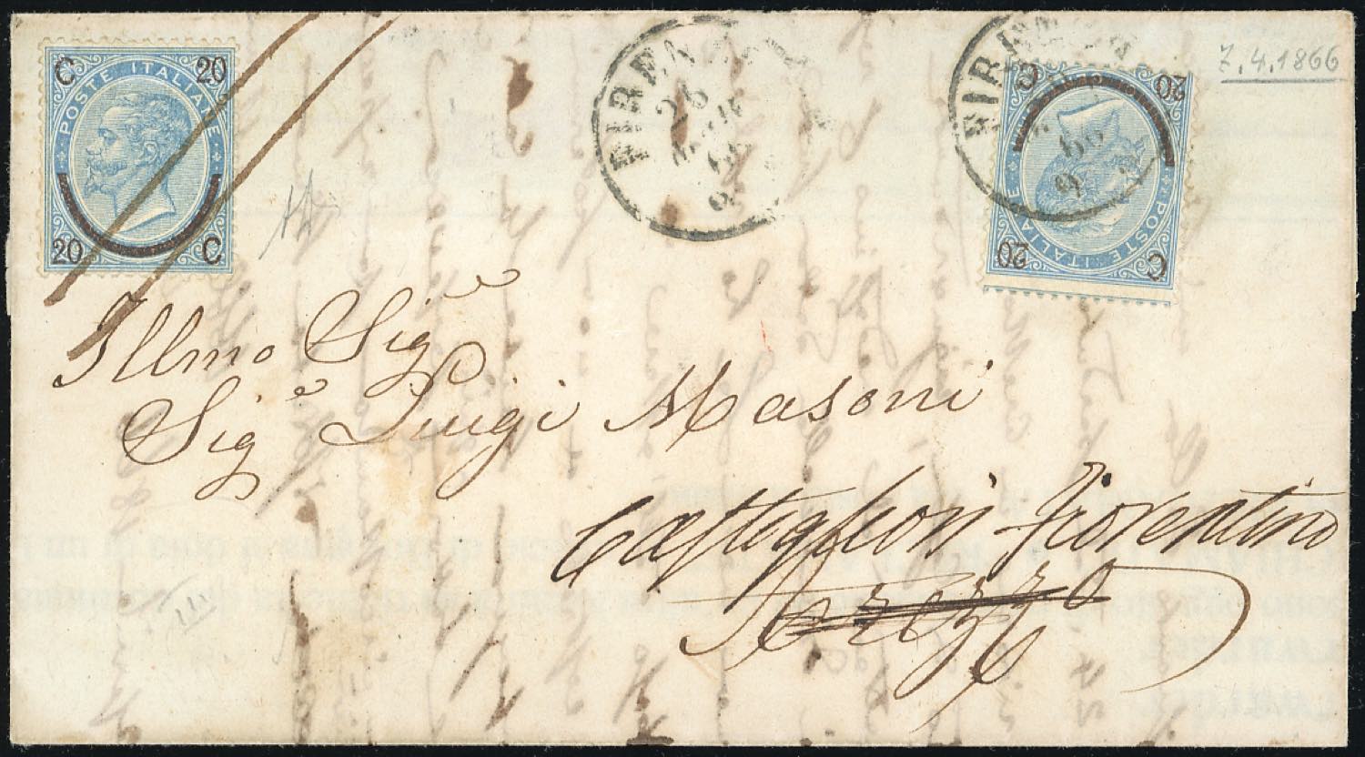 1866 - 20 cent. su 15 cent. Ferro di cavallo, III tipo (25), perfetto, su lettera da Firenze 26/3/1866 ad Arezzo, rispedita a Castiglione Fiorentino dopo essere stata riaffrancata con un altro francobollo identico, annullato a penna. Interessante e rara.