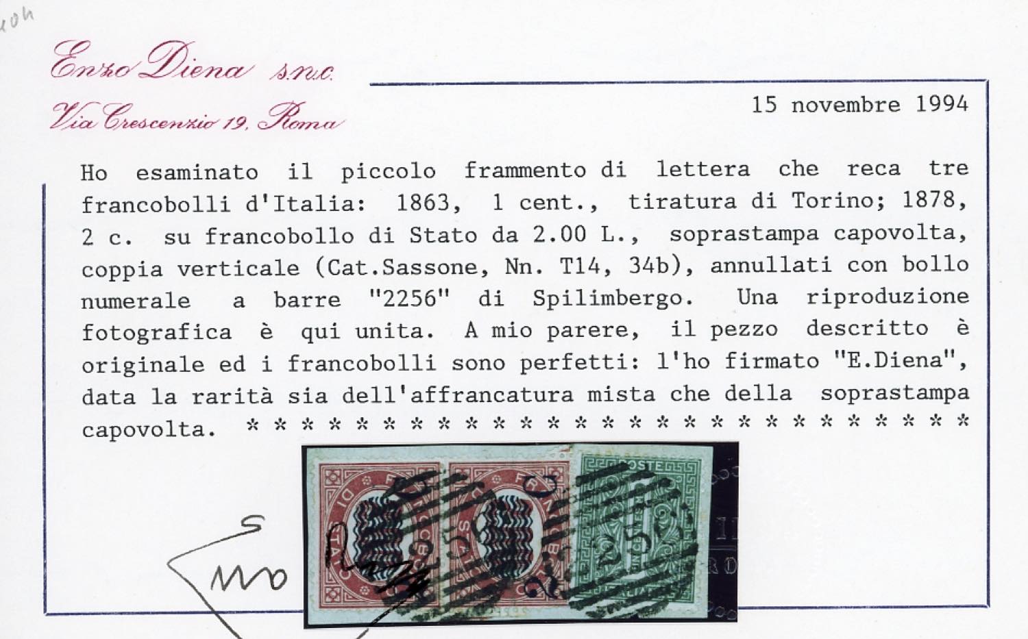1878 - 2 cent. su 2 lire Servizio soprastampati, due esemplari SOPRASTAMPA CAPOVOLTA e 1 cent. De La Rue, tiratura di Torino (34b, T14), usati su frammento con il numerale a sbarre 2256 di Spilimbergo. Insieme molto raro! Giulio Bolaffi, Em. e A.Diena, cert. Diena.