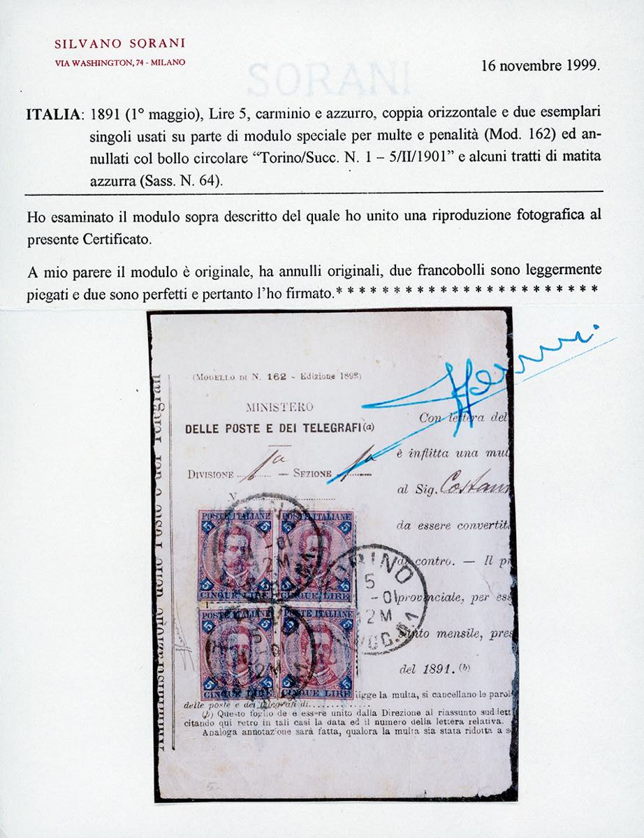 1901 - 5 lire carminio e azzurro Umberto I (64), coppia, lieve piega, e due singoli, perfetti, su gran parte di modulo per ammenda al personale, Torino 5/2/1901. Molto rara! Cert. Sorani.