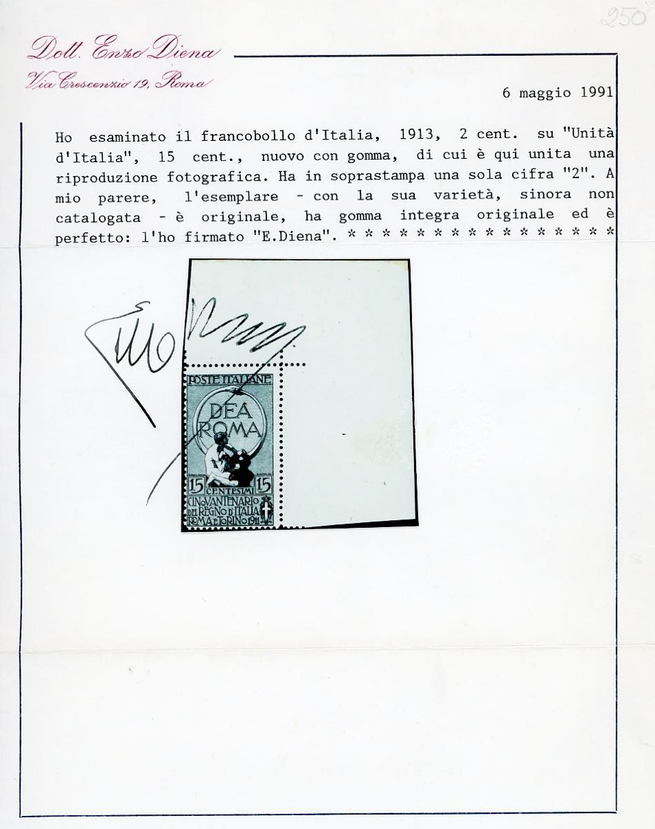 1913 - 2 cent. su 15 cent. Unità d'Italia, un solo "2" in soprastampa (101f), angolo di foglio, gomma integra, perfetto. Rara varietà di ottima qualità. Cert. E.Diena.