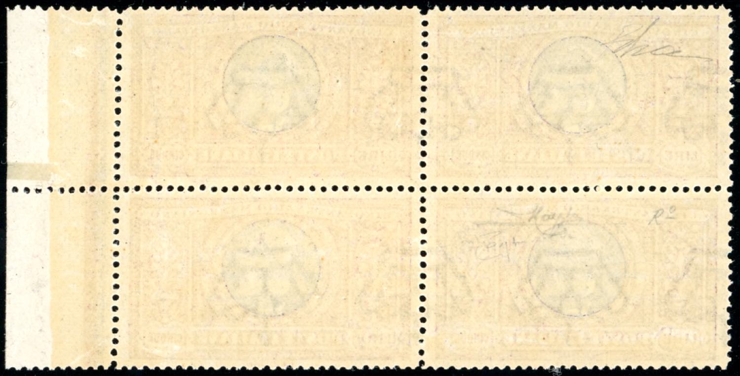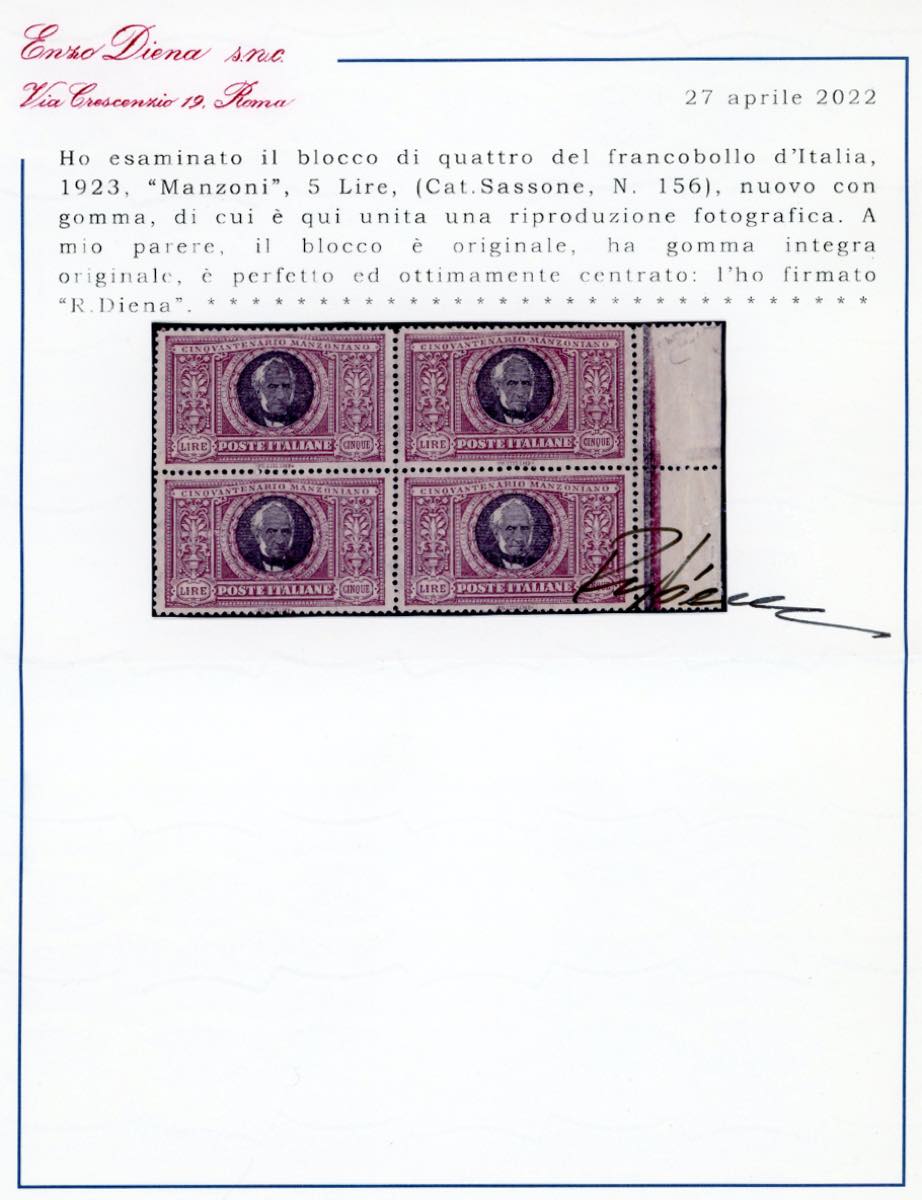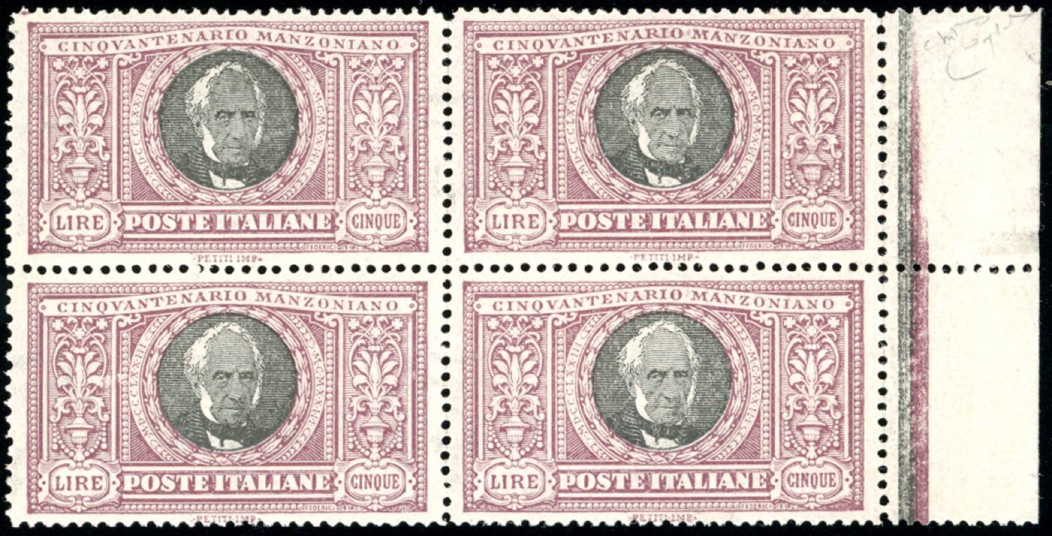 1923 - 5 lire Manzoni, dentellatura lineare anziché a pettine (156c), eccezionale blocco di quattro, bordo di foglio, nuovo, gomma originale integra, perfetto e ben centrato. Splendido e molto raro! Cert. Diena.