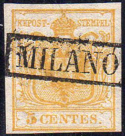 1850 - 5 cent. giallo, I tiratura (1a) perfetto, usato a Milano. A.Diena, Ferrario.