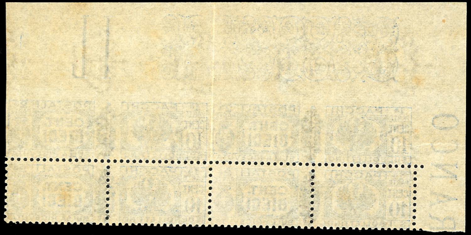 1945 - 10 cent. soprastampato, blocco di quattro con i due esemplari superiori dentellati solo in basso (49fa), angolo di foglio, gomma originale integra, perfetto. Ferrario.