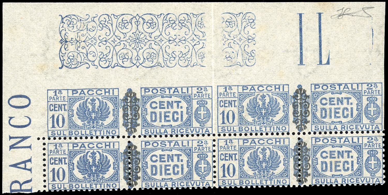 1945 - 10 cent. soprastampato, blocco di quattro con i due esemplari superiori dentellati solo in basso (49fa), angolo di foglio, gomma ... Read more