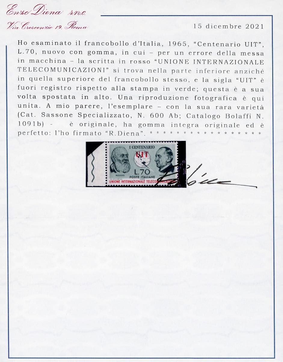 1965 - 70 lire Centenario UIT, varietà diciture in basso, francobollo naturale (Bol.1091B € 39.000, Sass.996a), bordo di foglio, gomma originale integra, perfetto. Splendido e raro! Tiratura 80 esemplari. Cert. Diena.