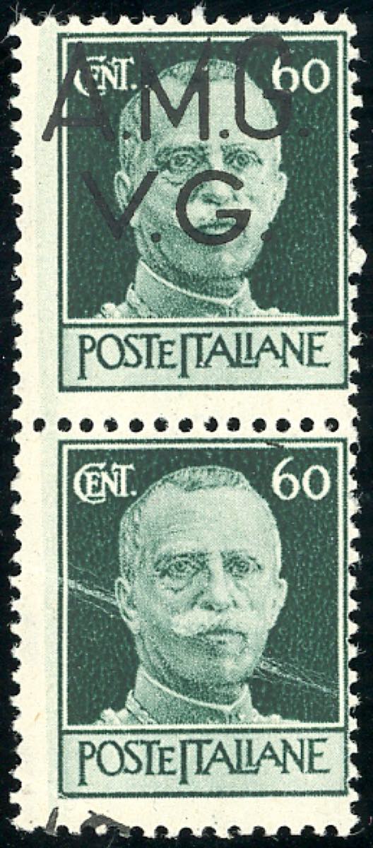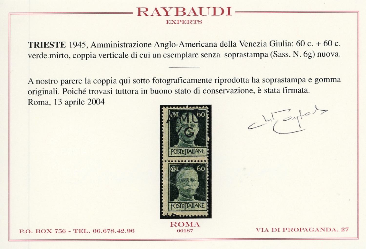 1945 - 60 cent. Imperiale, coppia verticale, il secondo esemplare senza soprastampa, a causa di una piegatura del foglio (6g), gomma originale, perfetta. Rara. A.Diena, cert. Raybaudi (cat.Sassone € 3.000 per gomma integra).