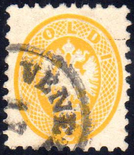 1865 - 2 soldi giallo, dent. 9 1/2 (41), perfetto, usato a Venezia. Ferrario.
