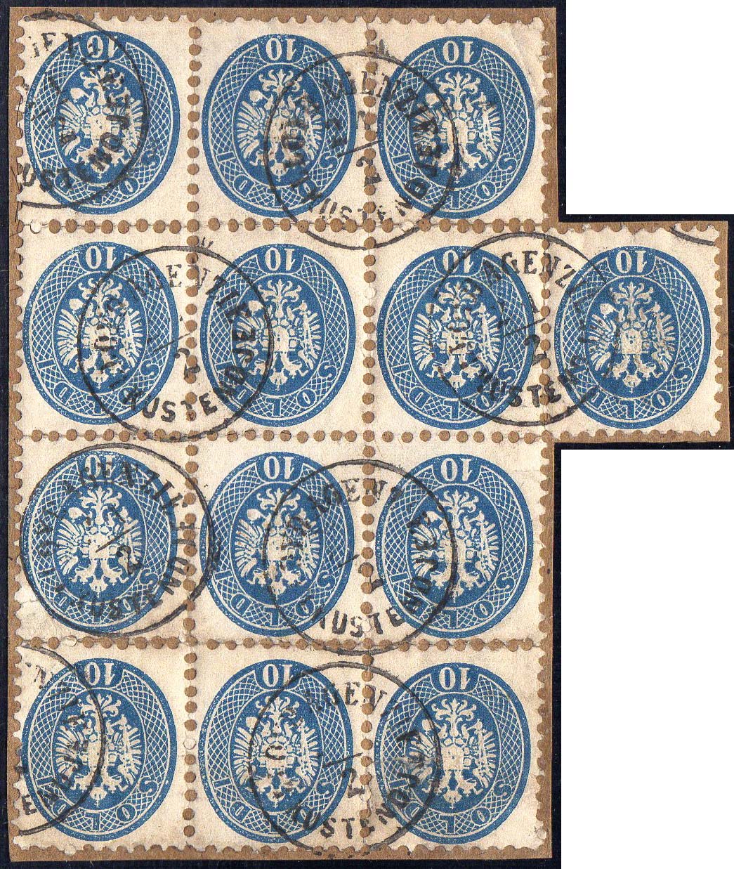 1864 - 10 soldi azzurro, dent. 9 1/2 (44L), eccezionale bloccodi 13 usato su frammento con annullo del LLOYD, perfetto. Splendido e raro! ... Read more