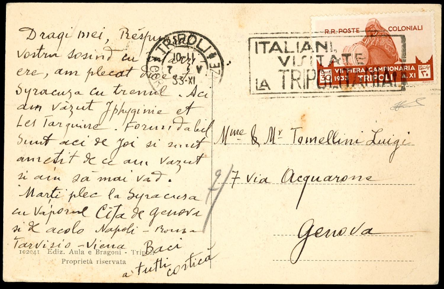 1933 - 30 cent. VII Fiera di Tripoli (120), perfetto, su cartolina da Tripoli 7/5/1933 a Genova. Ferrario.