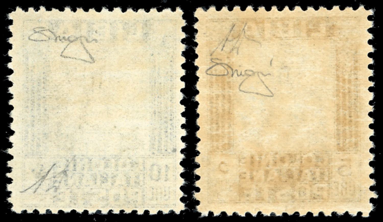 1937 - 5 lire, 10 lire Pittorica, dent. 11 (144,145), ottima centratura per il raro 5 lire, gomma originale integra, perfetti. Molto belli. A.Diena, cert. Oro Raybaudi.