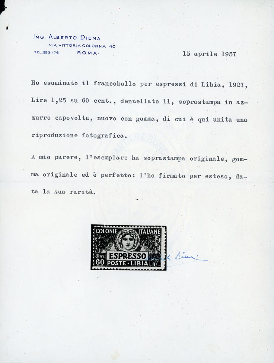 ESPRESSI 1927 - 1,25 lire su 60 cent., soprastampa capovolta e fortemente spostata a destra, senza sbarrette in alto (12ba), gomma originale, perfetto. Rarissimo! Cert. A.Diena.