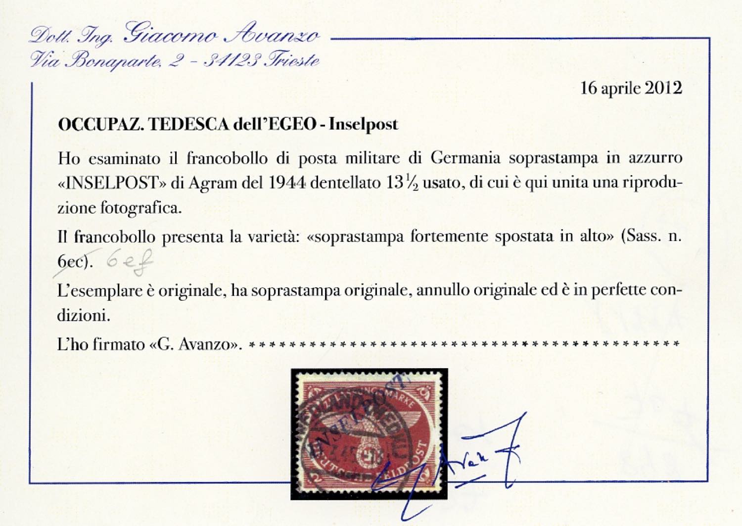 OCCUPAZIONE TEDESCA EGEO 1945 - Inselpost bruno rosso dent. 13 3/4, soprastampa di Agram fortemente spostata in alto (6ef), perfetto, usato il 19/3/1945. Cert. Avanzo e Sorani.