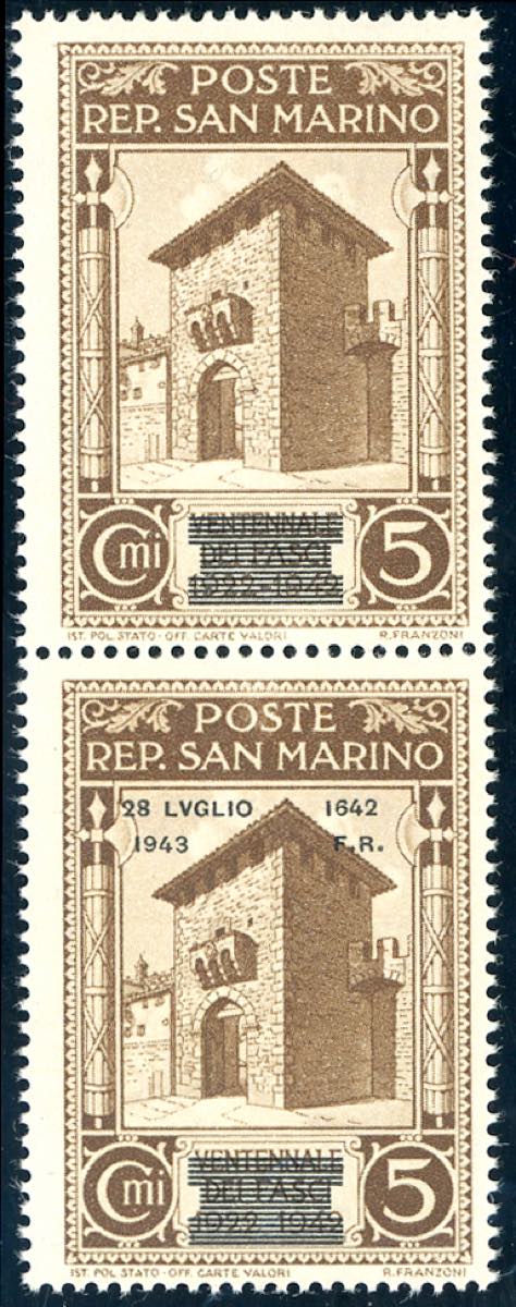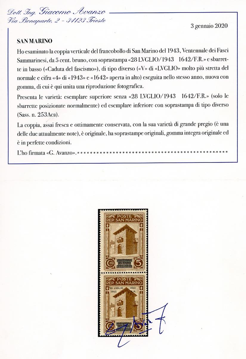 1943 - 5 cent. Caduta del Fascismo, soprastampa di tipo diverso, coppia verticale, il primo esemplare senza la data (253Aca), gomma ... Read more