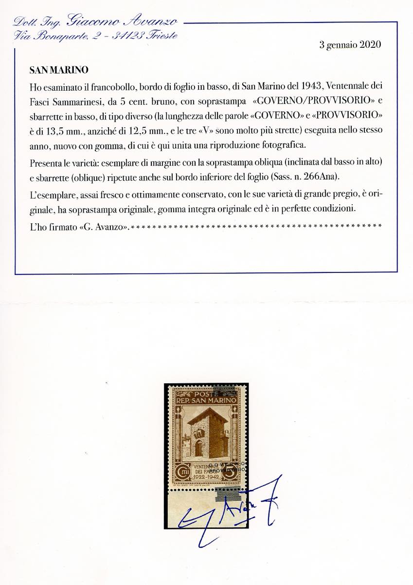 1943 - 5 cent. soprastampa "Governo Provvisorio" di tipo diverso obliqua, sbarrette ripetute anche sul bordo inferiore di foglio (266Ana), ... Read more