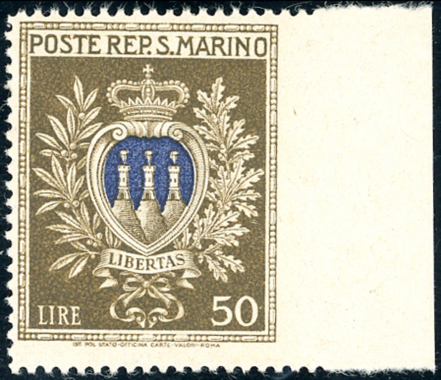 1946 - 50 lire Stemmi, non dentellato a destra, bordo di foglio (295d), gomma originale integra, perfetto. Bello.