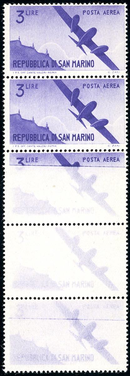 1946 - 3 lire Vedute (54), striscia verticale di cinque, tre esemplari con stampa fortemente evanescente, gomma originale integra, ... Read more