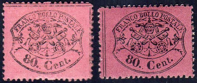 1868 - 80 cent. rosa chiaro e lilla rosso, non emesso (30,31), nuovi, gomma originale, perfetti. Ottima qualità.