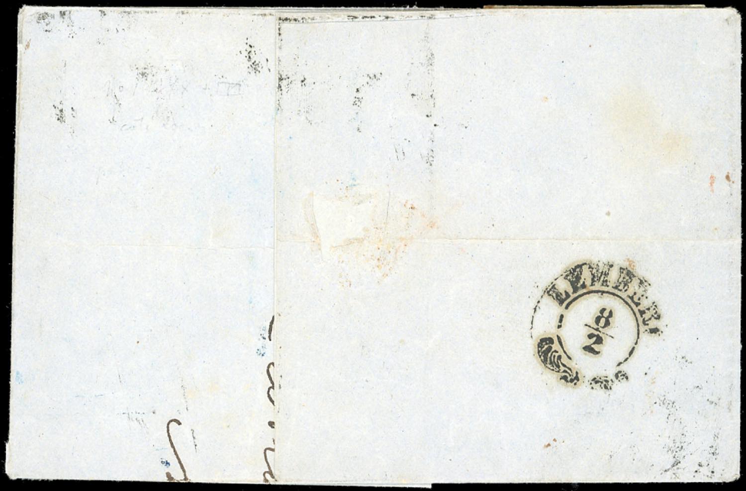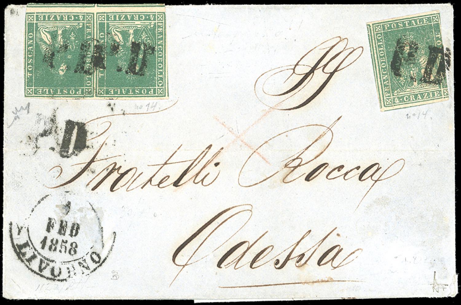 TOSCANA-IMPERO RUSSO UCRAINA 1858 - 4 crazie verde (14), singolo e coppia orizzontale con interspazio di gruppo in basso, su lettera franca a destino da Livorno 1/2/1858 ad Odessa, in Ucraina, al verso il transito di Lemberg (Leopoli) 8/2/1858. Rarissima destinazione. Ex coll. Imperato.