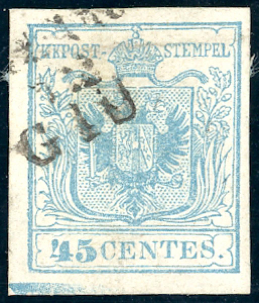 1850 - 45 cent. celeste, I tipo, I tiratura, carta a mano, spazio tipografico orizzontale in basso (10b/g), perfetto, usato a Milano 12/6/1850, primo mese d'uso. Raro insieme. Ferrario.