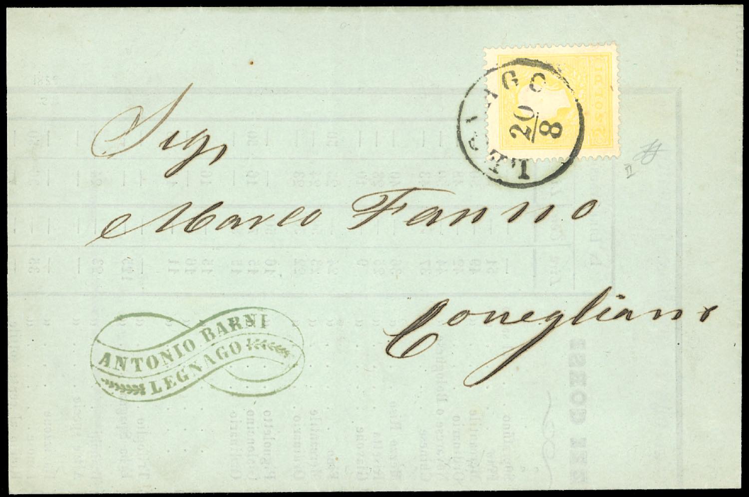 1859 - 2 soldi giallo, II tipo (28), perfetto e ben centrato, isolato su stampato da Legnago 20/8/1859 a Conegliano. Splendido insieme. Ferrario.