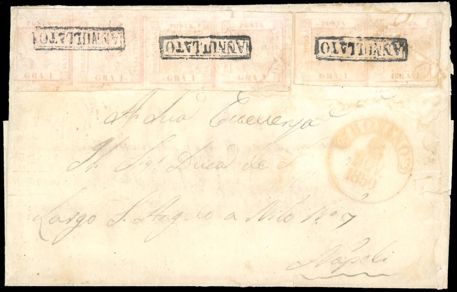 1859 - 1 grano rosa chiaro, I tavola (3), striscia di quattro e coppia, difetti, su sovracoperta di lettera da Bovino a Napoli 25/11/1859.
