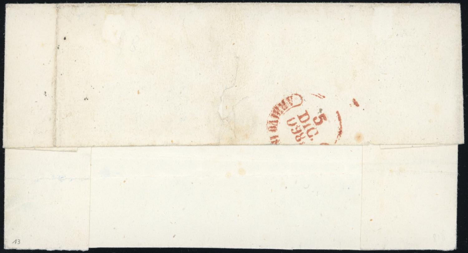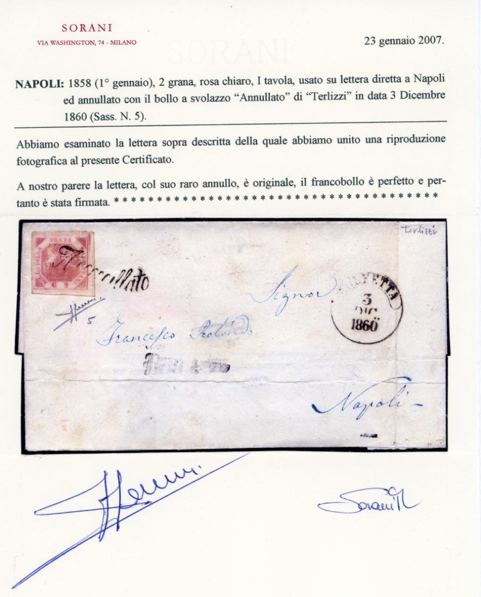 TERLIZZI, lineare + svolazzo e cerchio di Molfetta punti 13 - 2 grana (5), perfetto, su sovracoperta di lettera del 3/12/1860 per Napoli. Rara lettera in periodo di Luogotenenza di Carlo Farini. Cert. Sorani.